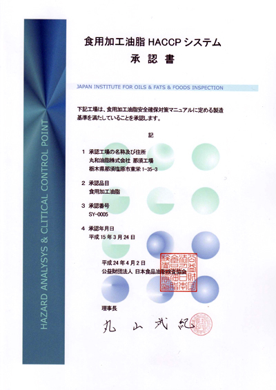 丸和油脂株式会社では、2024年に完全移設をした春日部工場にて運用を行ってきたFSSC22000の考え方と独自の食品安全マネジメントシステムの取り組みを通じて、自社3工場ならびに関連部門での食品安全管理の強化をしております。また、自社3工場についてはGFSIに認定された食品安全スキームの認証に向けて作業中です。